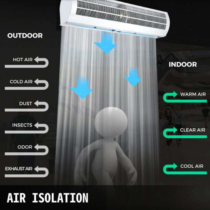 De luftgardin av TILRc Det er en kraftig vifte, som skaper en usynlig høyhastighets luftbarriere over inngangen. Isolerer innendørs og utendørs luftmiljø for å opprettholde temperaturforskjellen. Spar energi og bidrar til å forhindre at luft slipper ut til utsiden, og blokkerer inntrengning av flygende insekter, støv, varm eller kald luft og røyk.