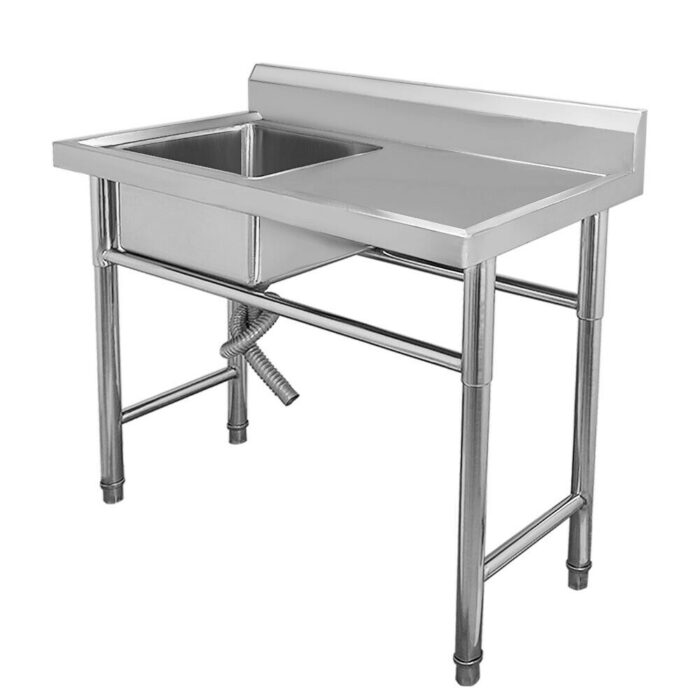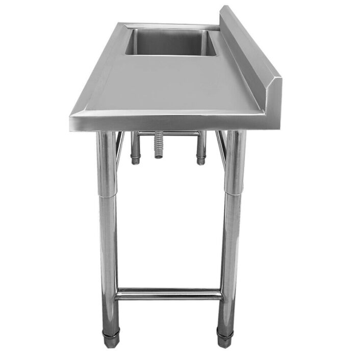 това работна маса с мивка ДОРc Той е ръчно изработен от висококачествена неръждаема стомана; Има отцедник. Цялата мивка е едно компактно парче полирана стомана със заварени зони и красиво сатенено покритие. Краката от неръждаема стомана с напречни скоби осигуряват стабилна опора.