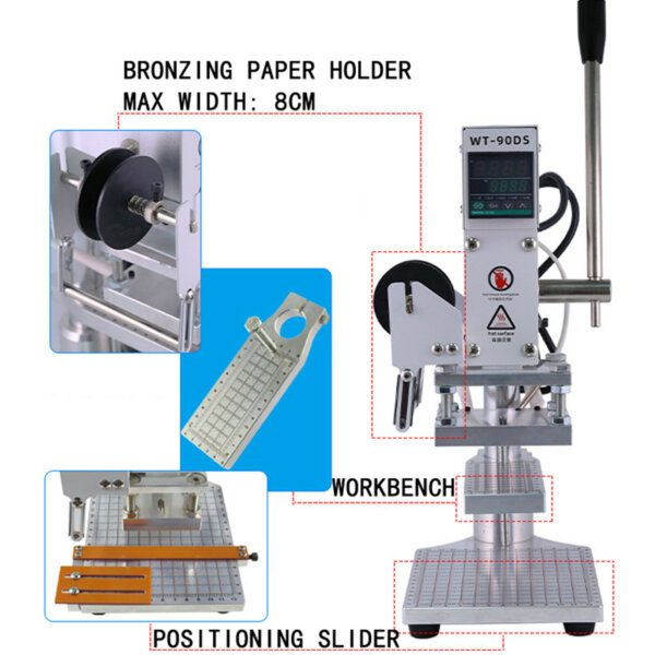 La máquina de estampado en caliente ARC está fabricada de acero inoxidable y aleación de aluminio. Cuenta con soporte para el papel, panel digital, placa base con escala y control deslizante de posicionamiento. La placa de prensado caliente es de 8 x 10 cm puede ajustar la altura hasta un máximo de 22 cm, conserva la temperatura constante ajustable de 0-350ºC.