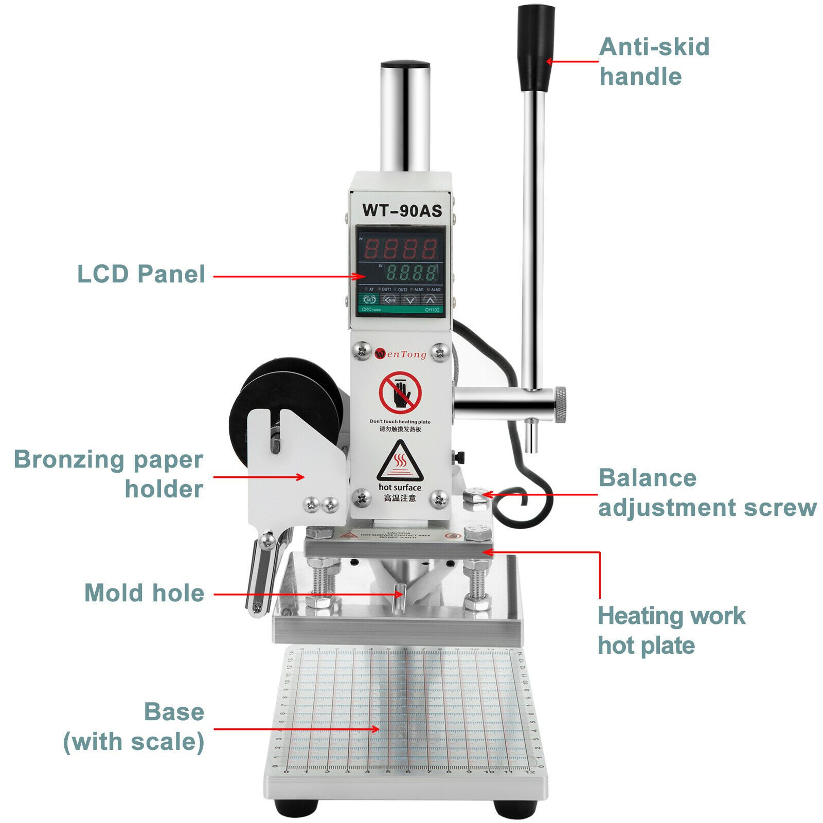 Las escalas verticales y horizontales de la tabla de estampado pueden tener una precisión de 1mm. El control deslizante de posicionamiento está hecho de plástico sintético, resistente a altas temperaturas, sin arañazos, para un posicionamiento más conveniente. Al igual que la altura a que realice la presión con una altura máxima de 22 cm