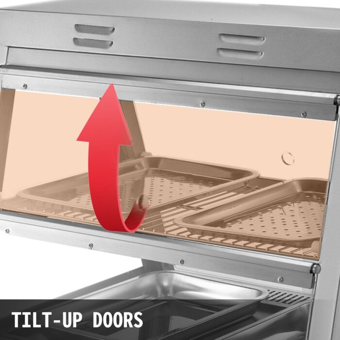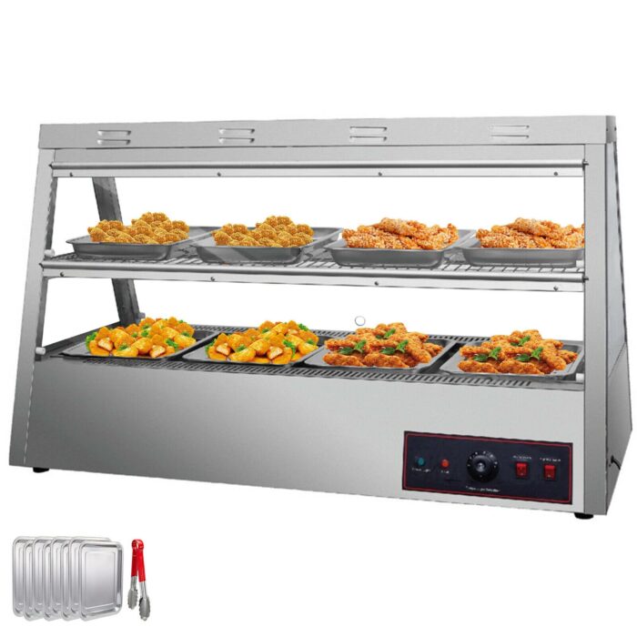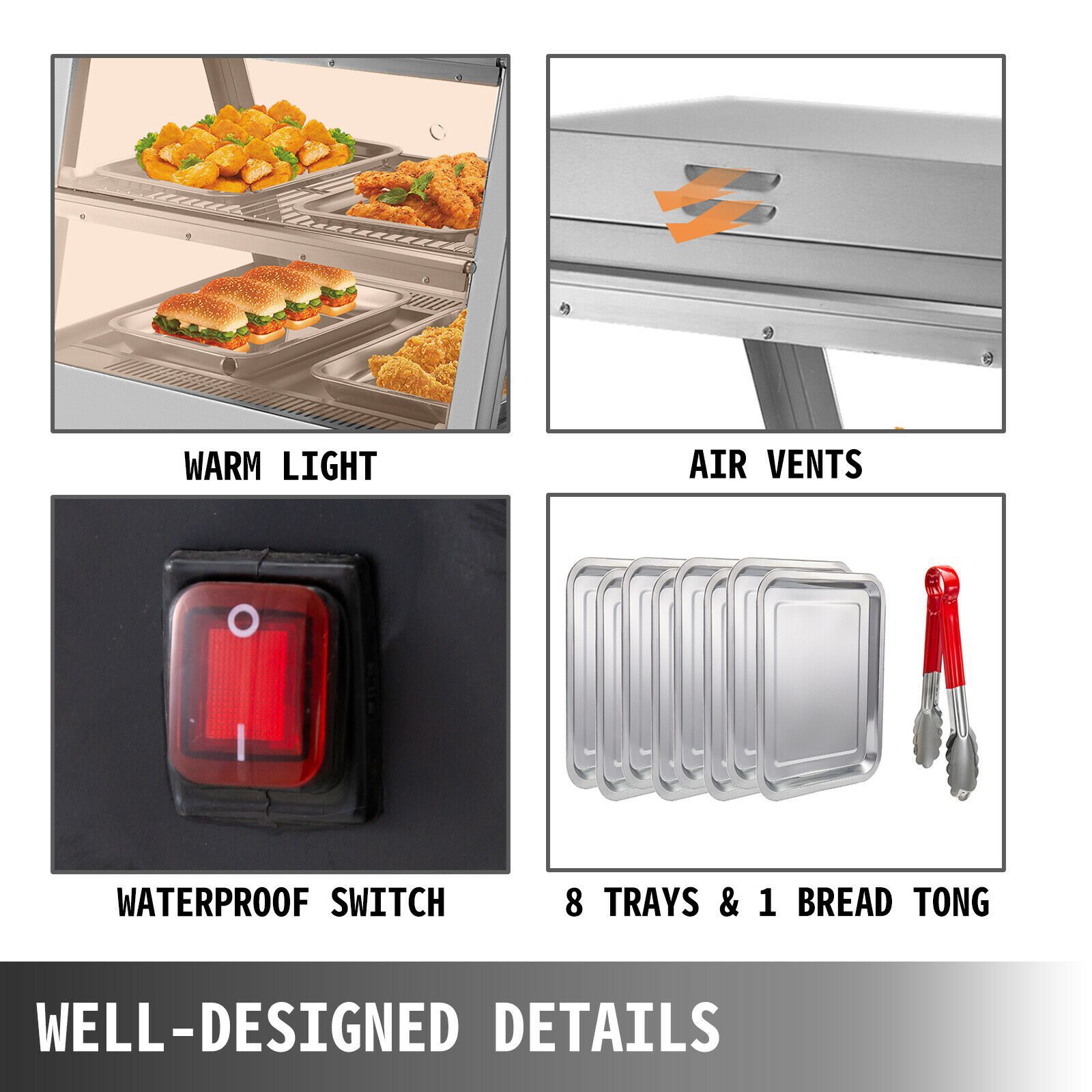 El expositor caliente cuenta con 2 niveles de soporte en los que se reparten 8 bandejas de acero inoxidable, proporcionando más espacio para almacenar alimentos de diferentes tamaños. Las luces cálidas decorativas permiten que los alimentos sean más atractivos y llamativos. El encendido/apagado de la vitrina caliente de ARC es fiable y mejora el factor de seguridad así la vida útil del calentador de contador; además de favorecer un consumo energético eficiente. Cuenta con una bandeja en la parte inferior para la recolección de aceite para facilitar su limpieza. Dispone de una temperatura termostática ajustable, la ARCVEC8B le facilita ajustar la temperatura según los distintos tipos de alimentos.